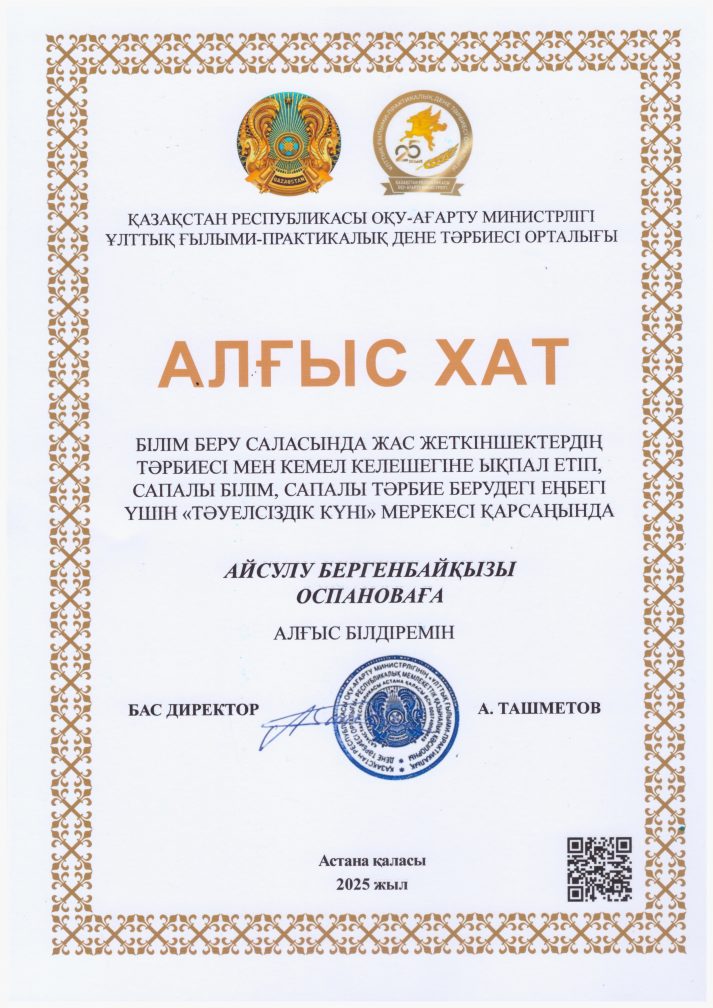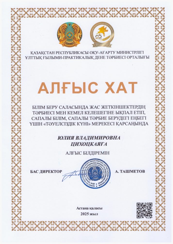 Дене шынықтыру нұсқаушысы Юлия Владимировна Цихоцкая мен Оспанова Айсұлу Бергенбайқызы Тәуелсіздік күні қарсаңында Қазақстан Республикасы Білім министрлігінің Ұлттық ғылыми-практикалық дене тәрбиесі орталығының алғыс хатымен марапатталды. Құттықтаймыз!